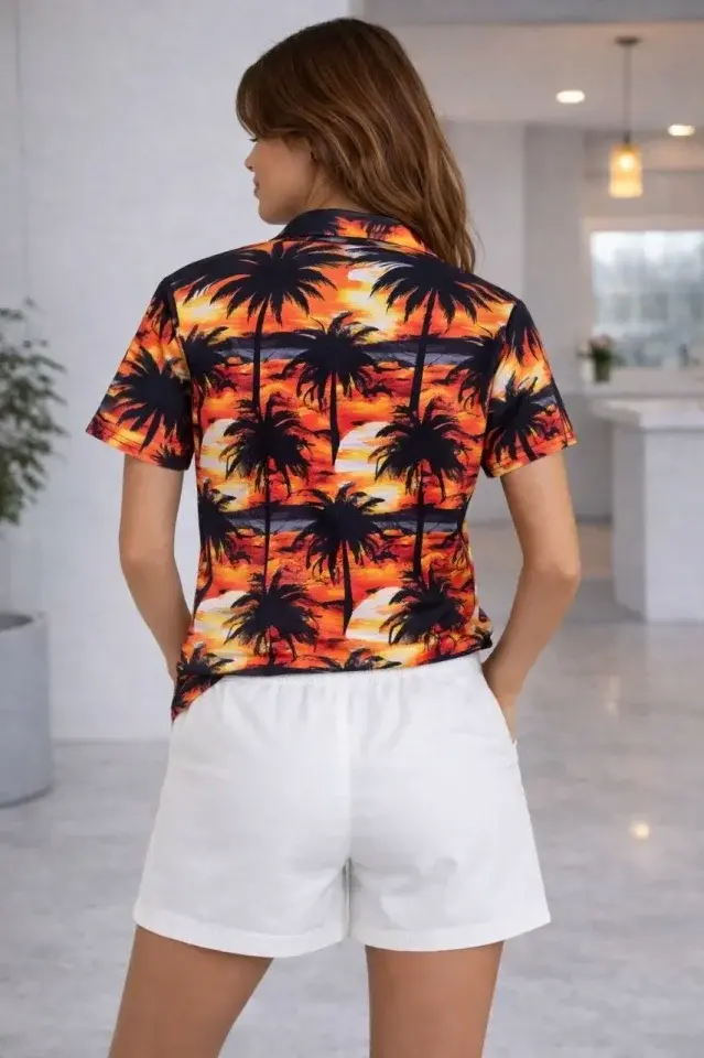 Tropikal Palmiye Desenli Gömlek Şort Takım Yazlık Rahat Kalıp - Desenli