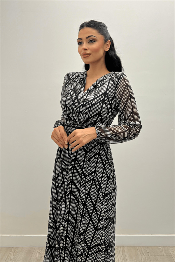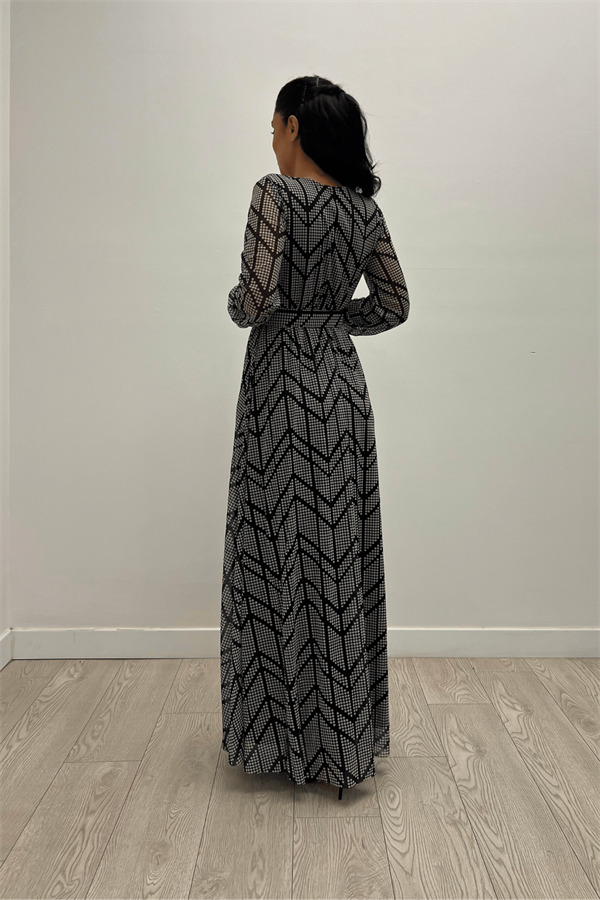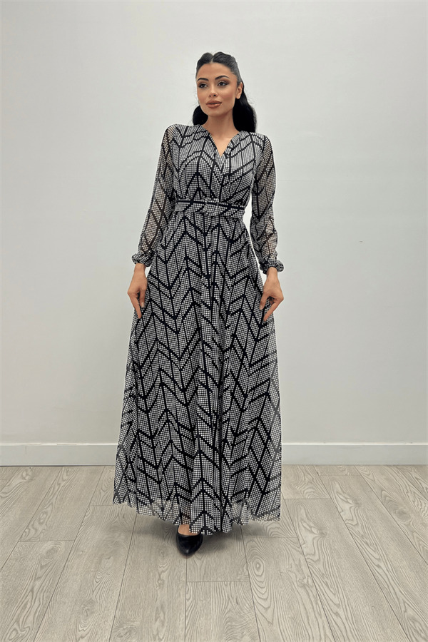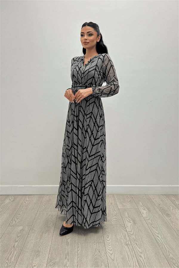 Tül Kumaş Asimetrik Desen Maksi Elbise