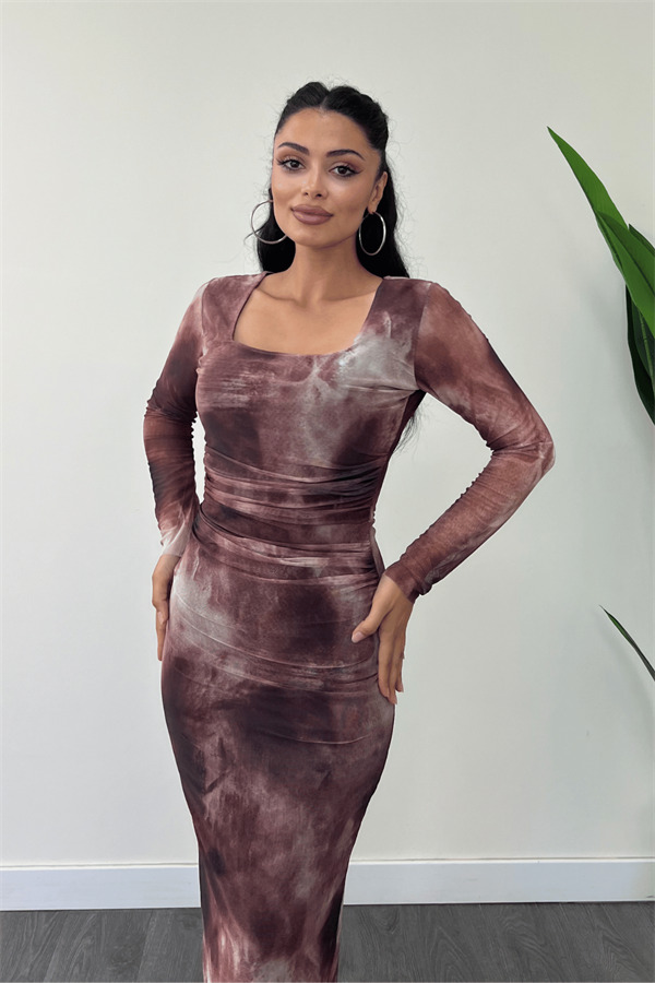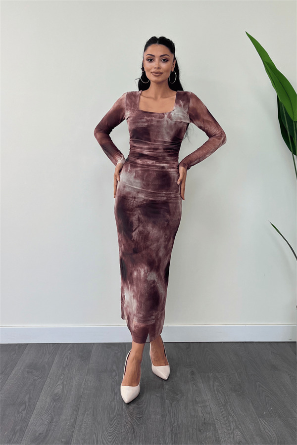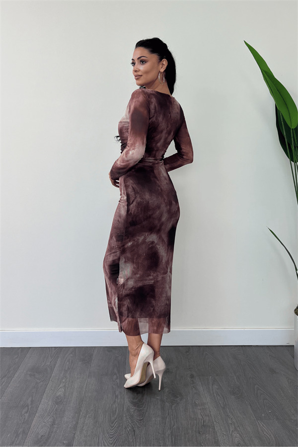 Tül Kumaş Büzgü Detaylı Kalem Elbise - BORDO