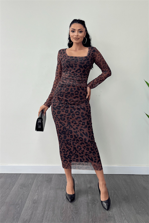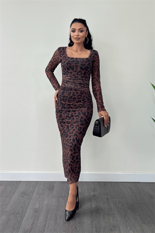 Tül Kumaş Büzgü Detaylı Kalem Elbise - KAHVERENGİ