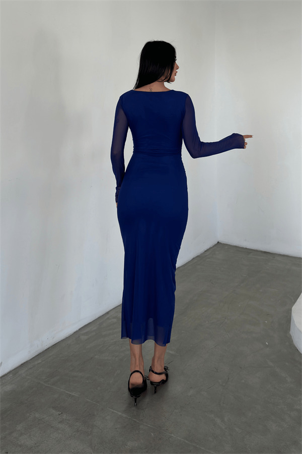 Tül Kumaş Büzgü Detaylı Kalem Elbise - MAVİ