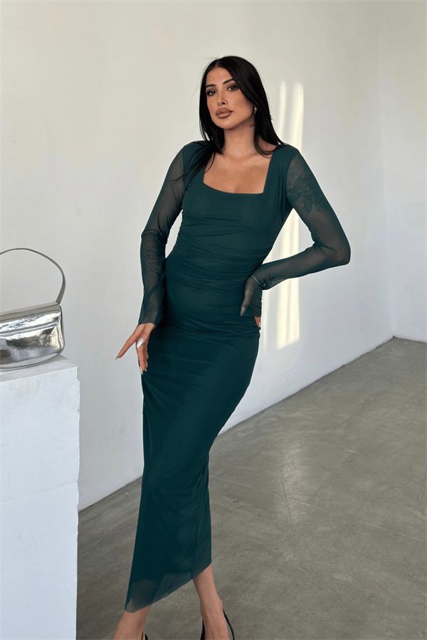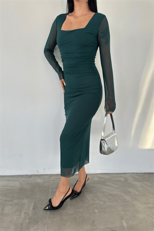 Tül Kumaş Büzgü Detaylı Kalem Elbise - ZÜMRÜT YEŞİL