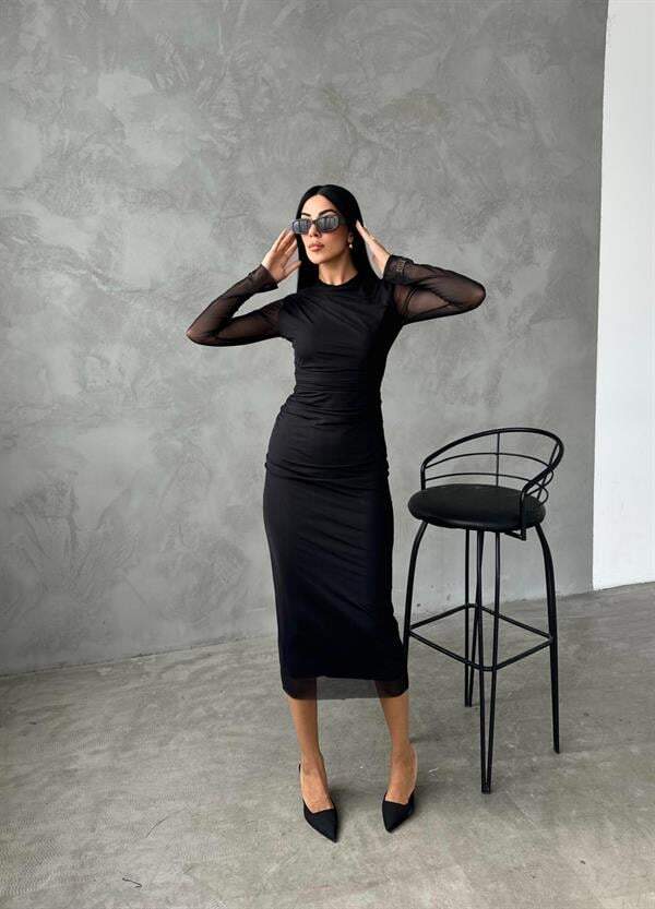 Tül Kumaş Drape Detaylı Kalem Elbise - SİYAH