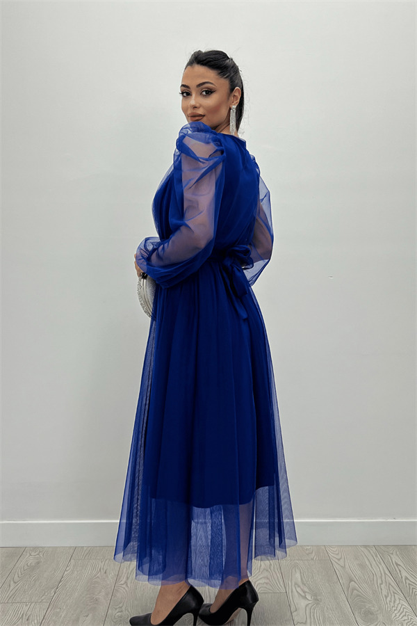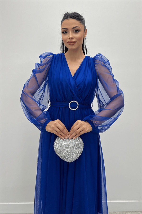Tül Kumaş Kruvaze Yaka Taş Kemer Detaylı Elbise - SAKS MAVİ
