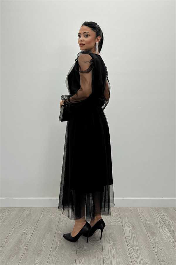 Tül Kumaş Kruvaze Yaka Taş Kemer Detaylı Elbise - SİYAH