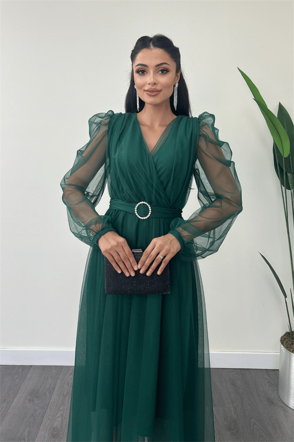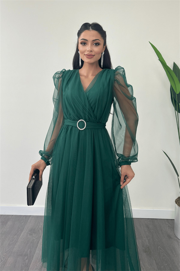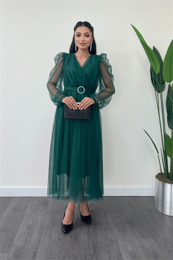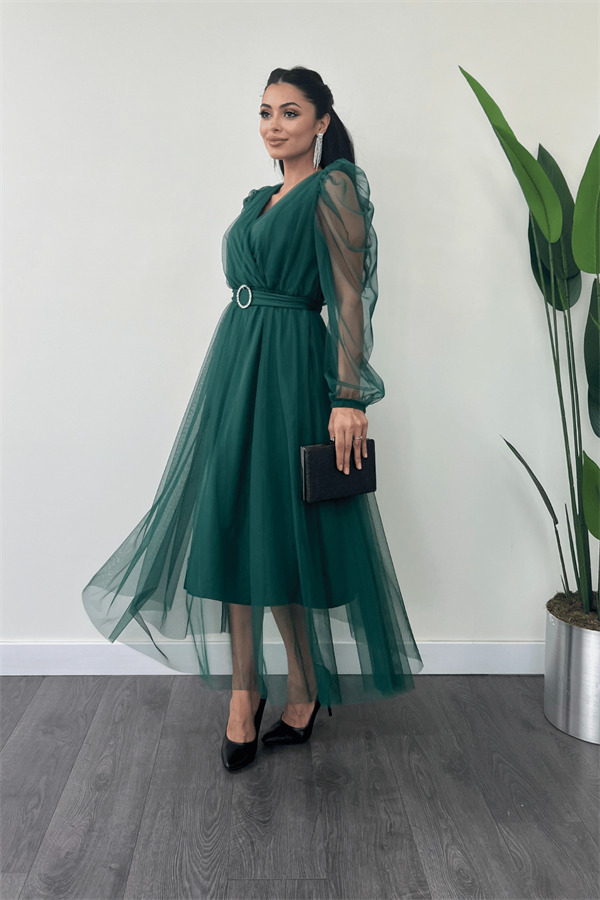 Tül Kumaş Kruvaze Yaka Taş Kemer Detaylı Elbise - ZÜMRÜT YEŞİL