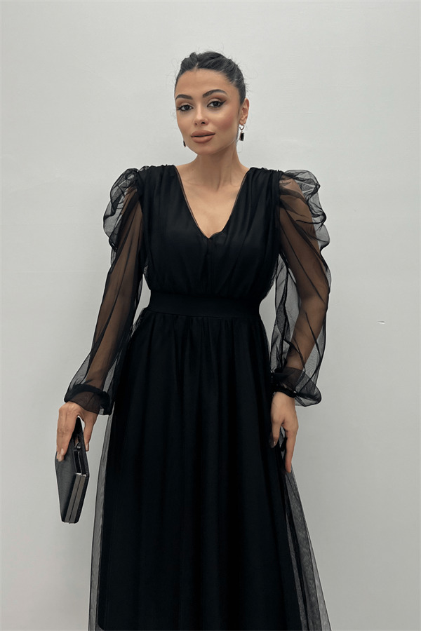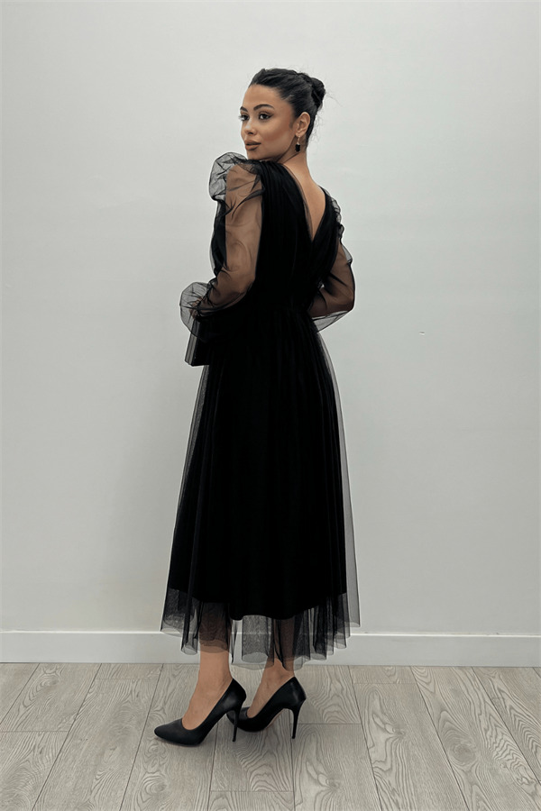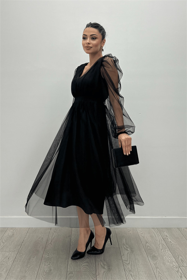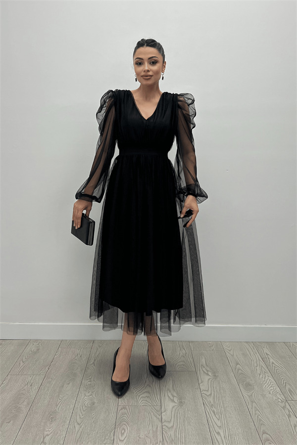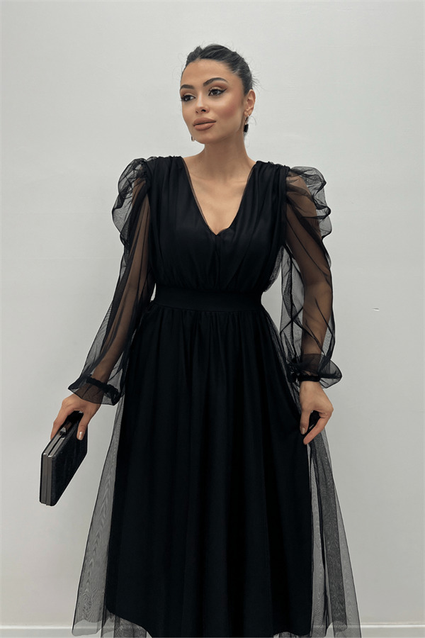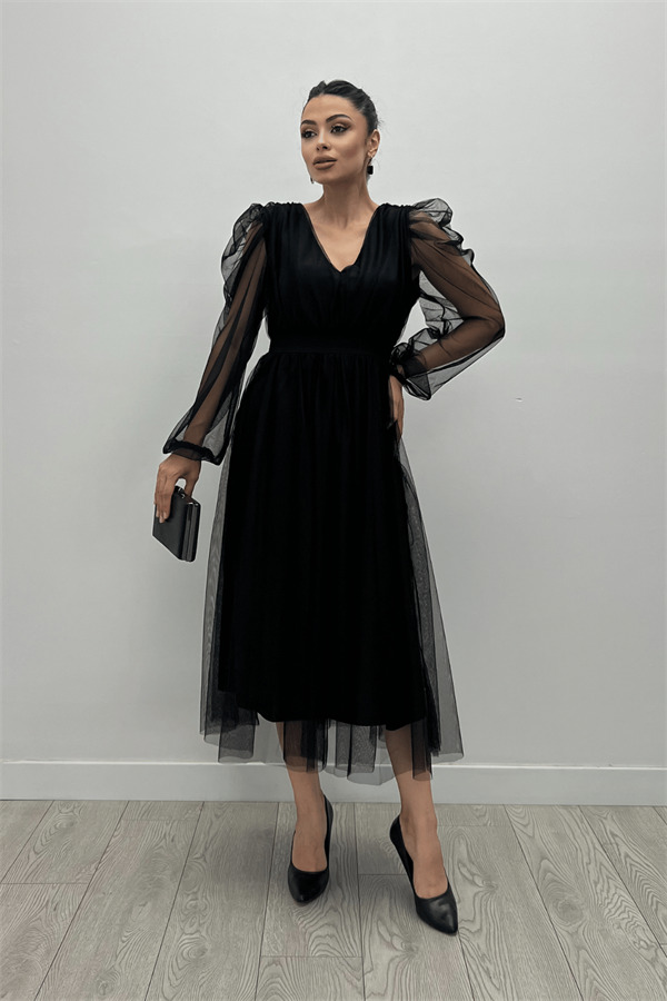 Tül Kumaş V Yaka Midi Detaylı Elbise - SİYAH