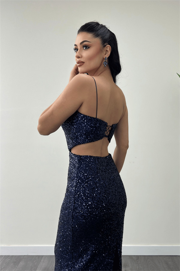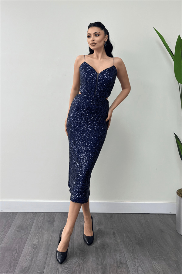 Tül Pul Payet Kumaş Sırt Detaylı Kalem Elbise - LACİVERT