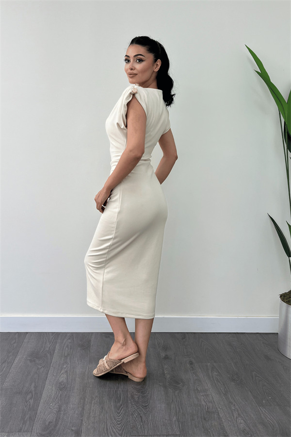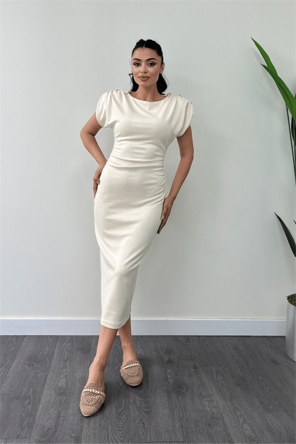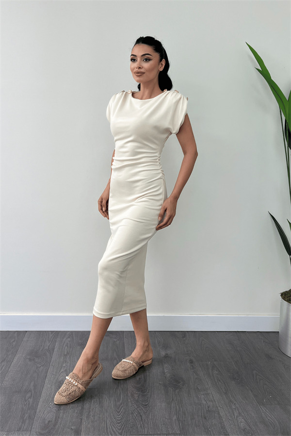 Üç İplik Penye Kumaş Omuz Detaylı Büzgülü Kalem Elbise - KREM