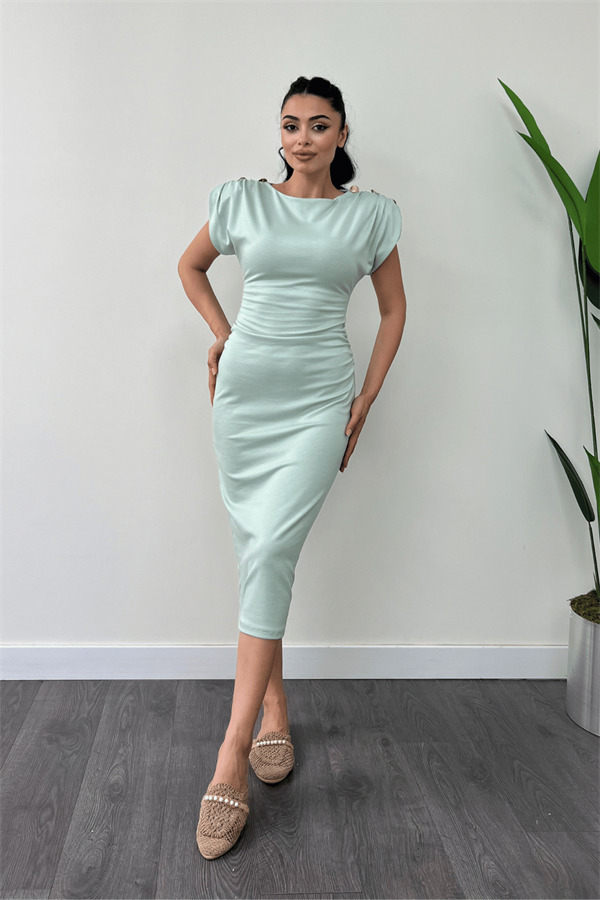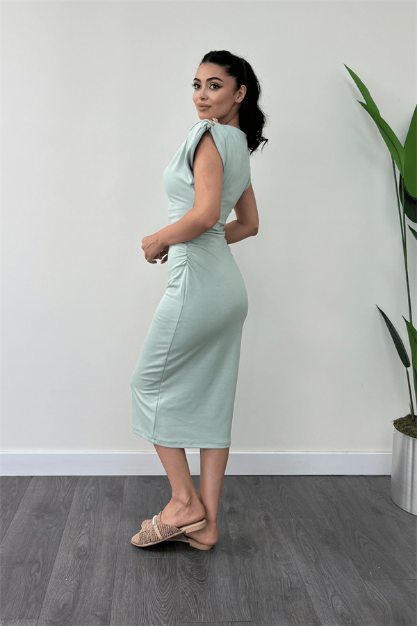 Üç İplik Penye Kumaş Omuz Detaylı Büzgülü Kalem Elbise - YEŞİL