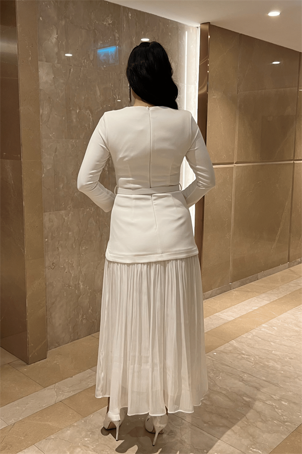 Üst Atlas Alt Şifon Kumaş Elbise - BEYAZ