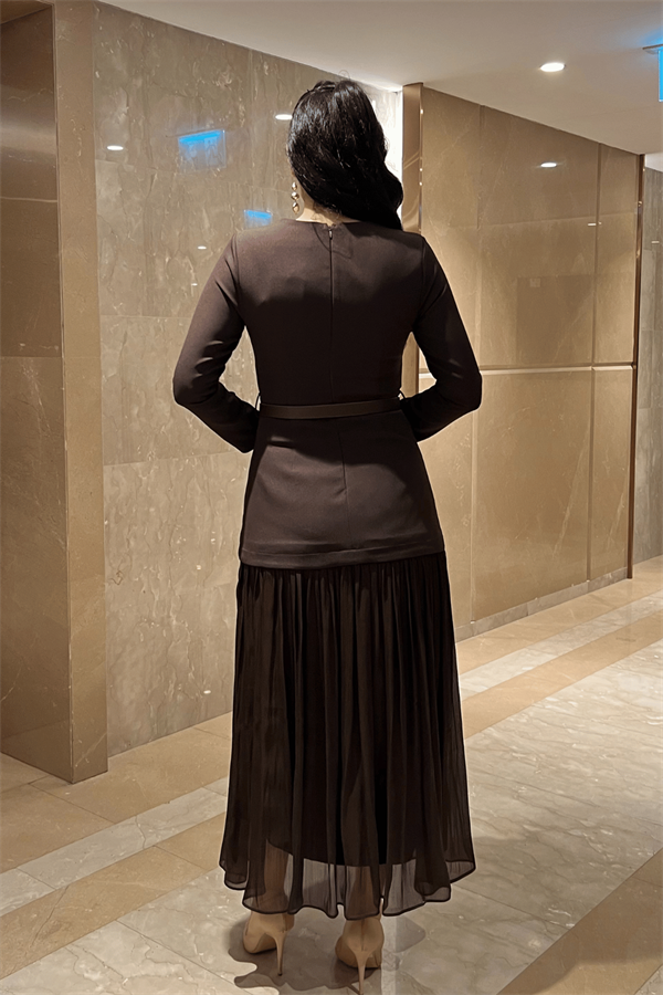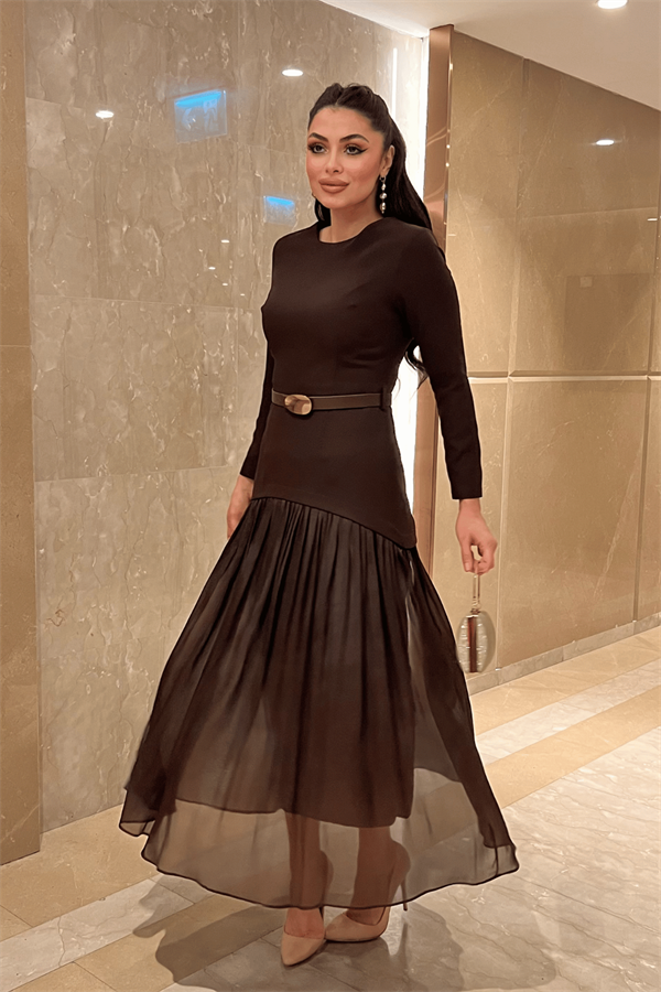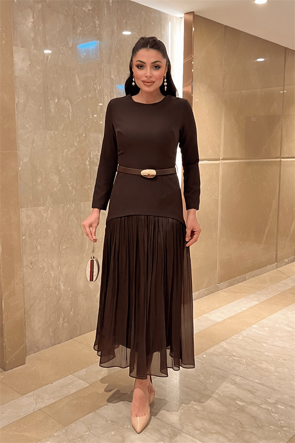 Üst Atlas Alt Şifon Kumaş Elbise - KAHVERENGİ