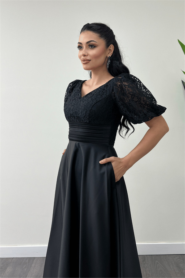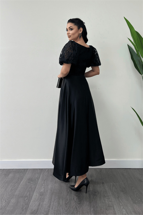 Üst Dantel Alt Saten Detaylı Midi Elbise - SİYAH