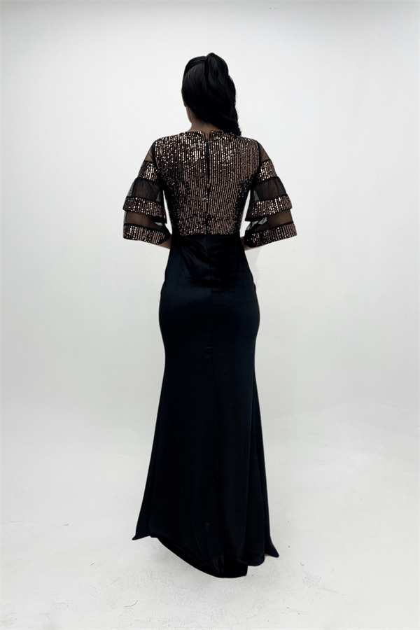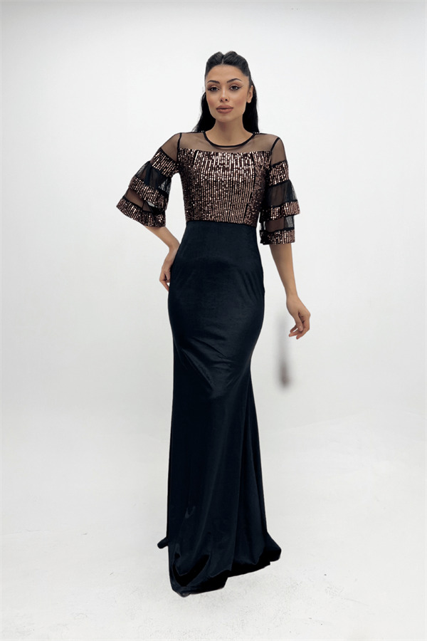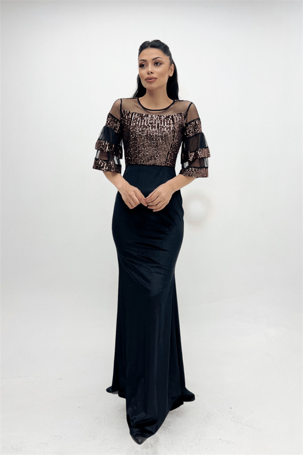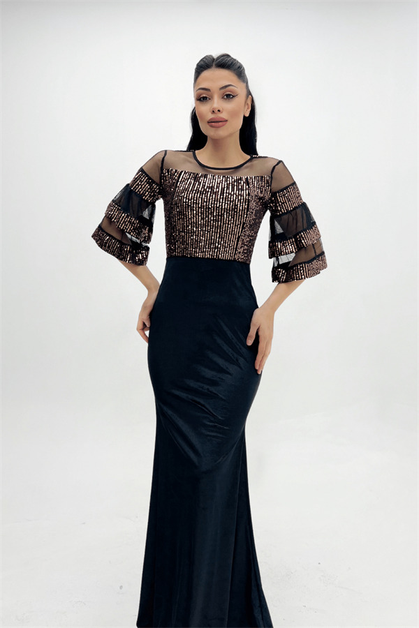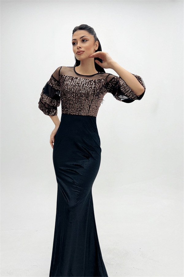 Üst Payet Alt Kadife Abiye Elbise - Bronz