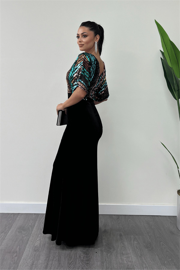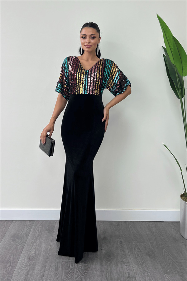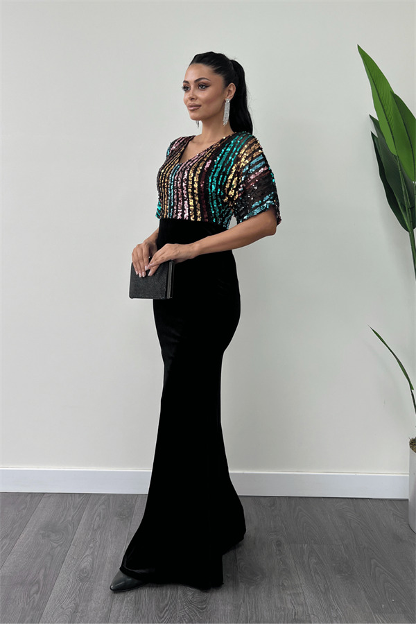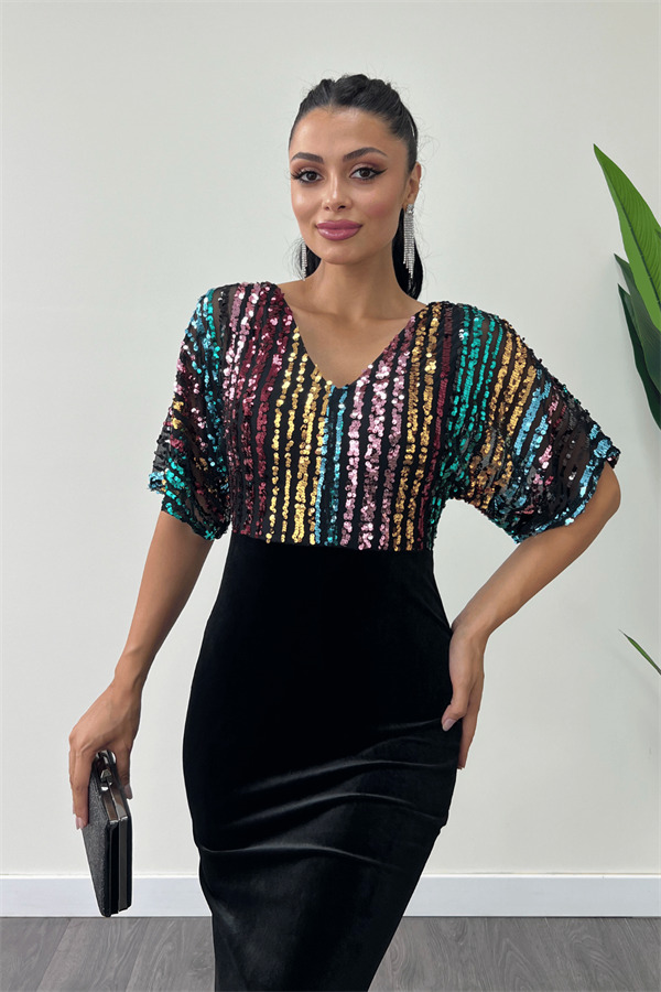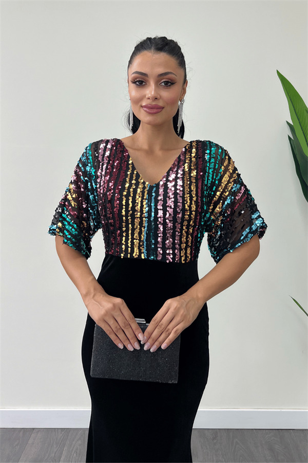 Üst Renkli Payet Alt Kadife Kumaş Yarasa Kol Balık Elbise