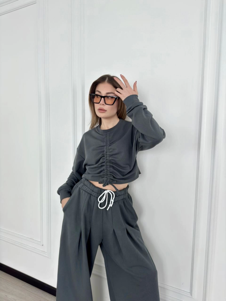Uzun Kollu Önü İp Büzgülü Crop Ve Pantolon İkili Takım - Antrasit