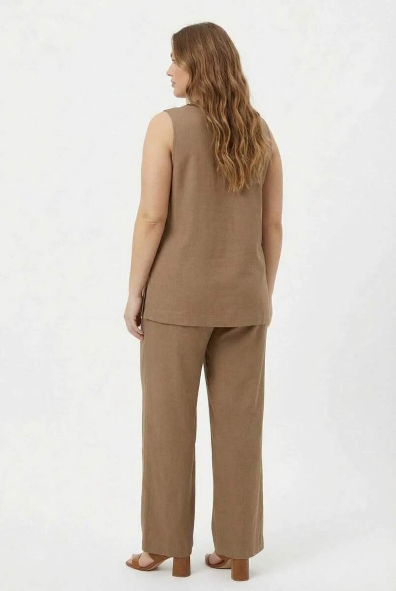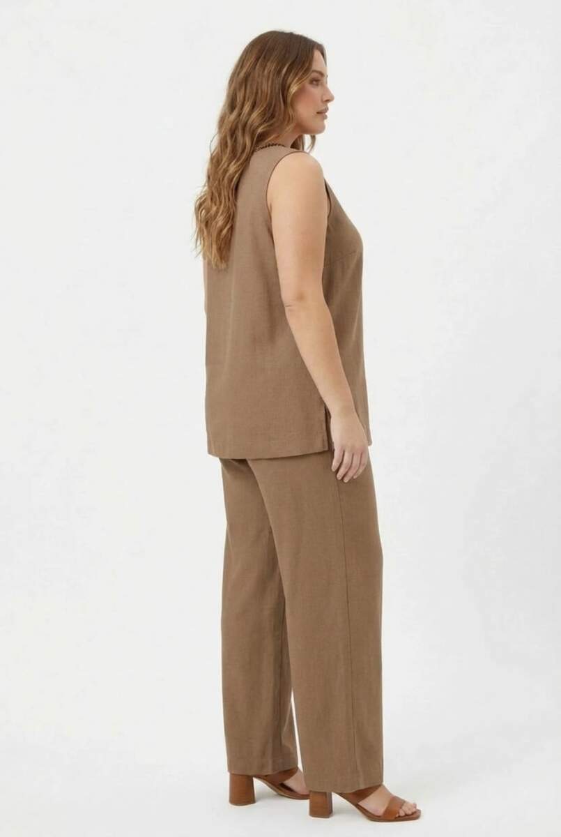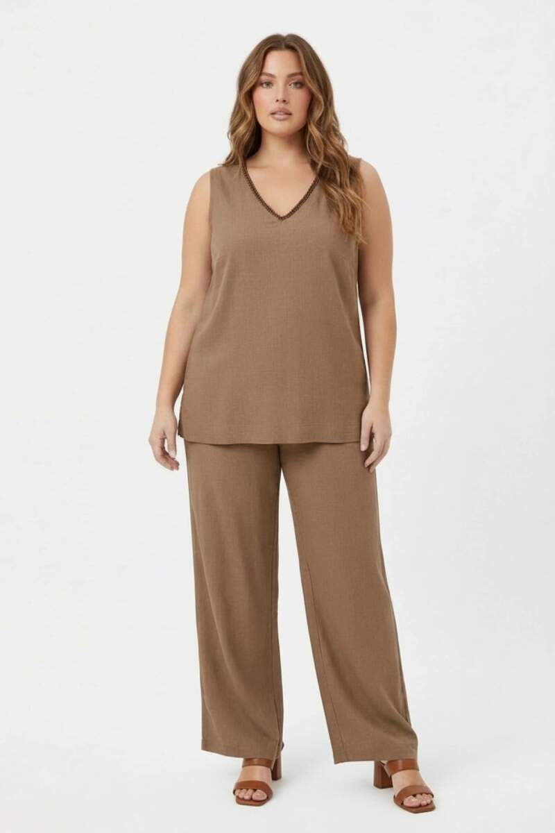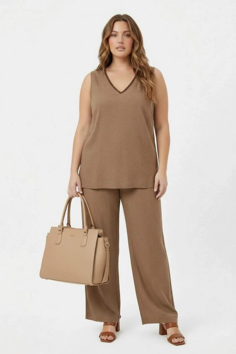 Yaka Boncuk Detaylı Kadın Büyük Beden Bluz Pantolon Takım Vizon