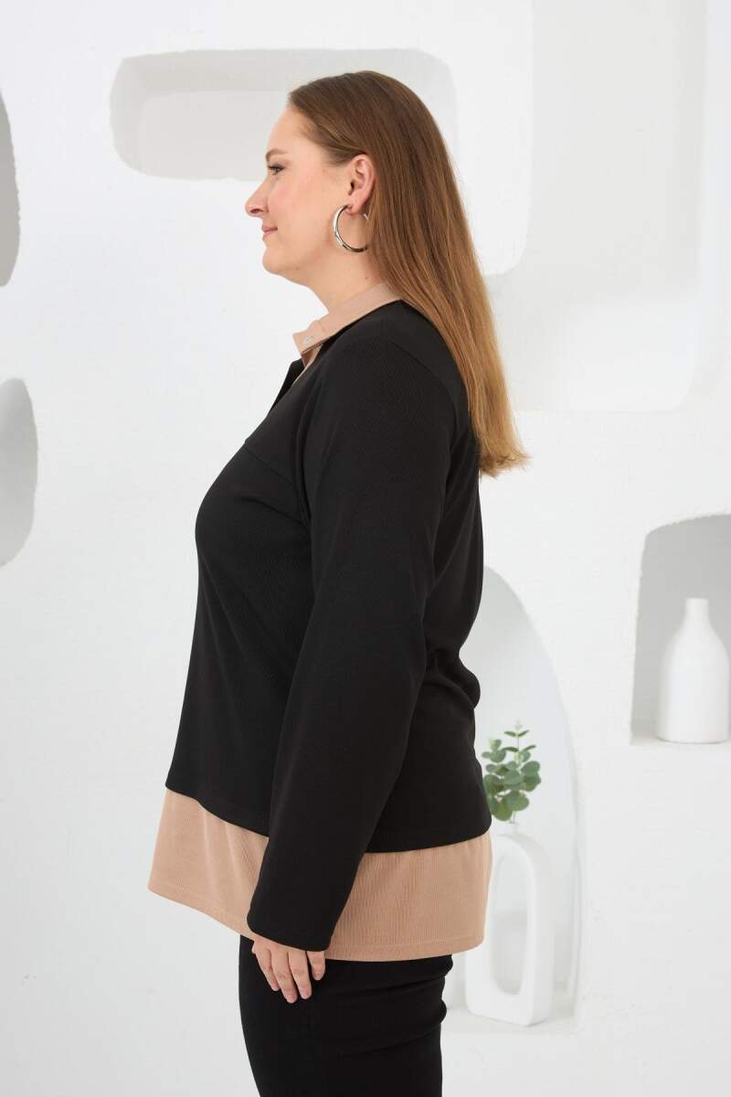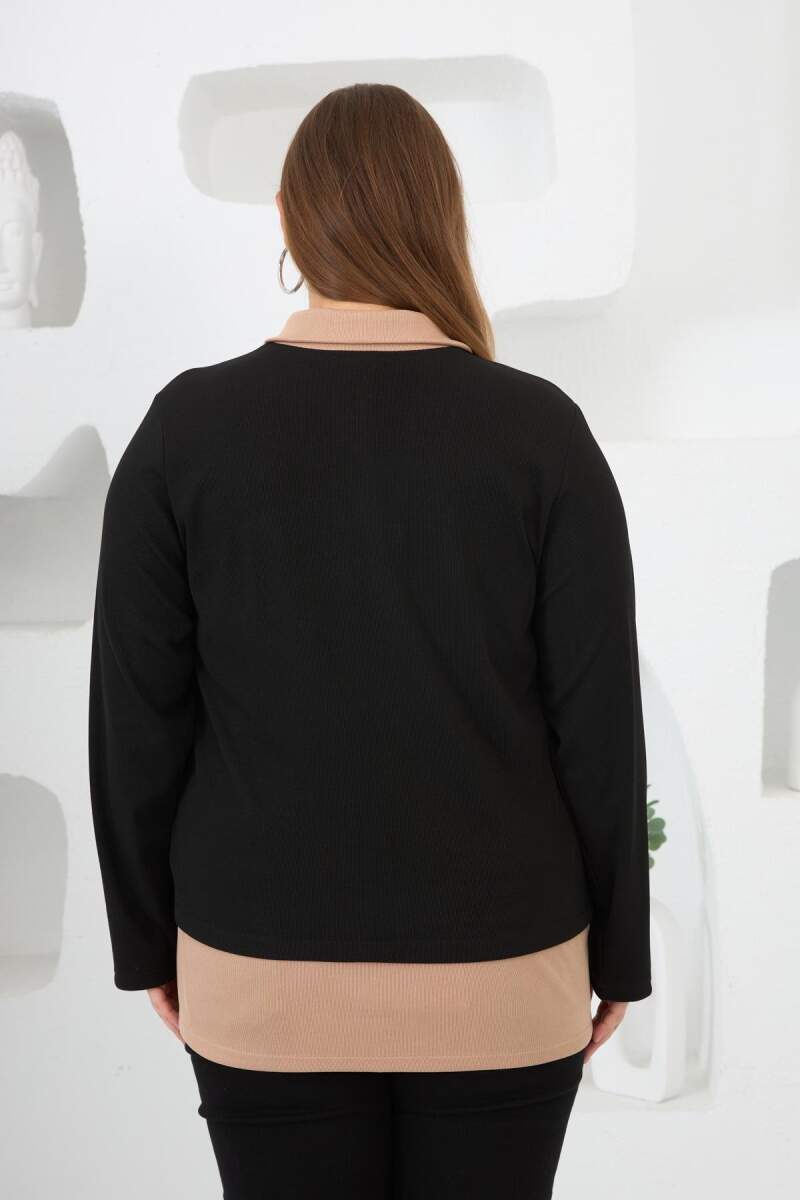 Modern ve rahat bir tarz sunan bu siyah sweatshirt, bej yakası ve alt etek ucu detayıyla kontrast bir görünüm oluşturur. Günlük şıklık için ideal olan model, yumuşak dokusuyla gün boyu konfor sağlar.