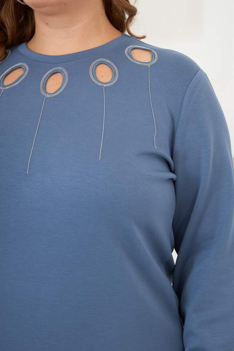 Yaka Detaylı Kol ve Eteği Büzgülü Büyük Beden Sweat İndigo