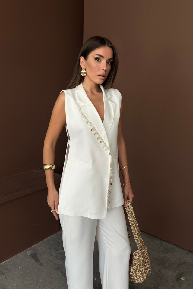 YAKA MİDYE KABUĞU SIRALI YELEK - PANTOLONTAKIM KETEN KUMAŞ - Beyaz