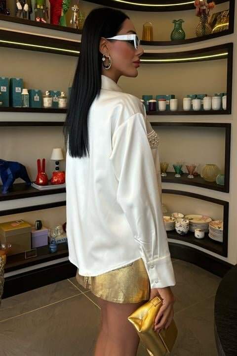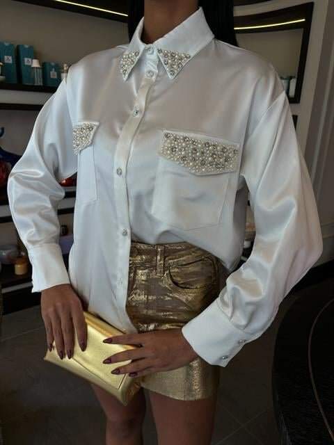 Yaka Ve Cep İnci Taşlı Saten Gömlek 3423