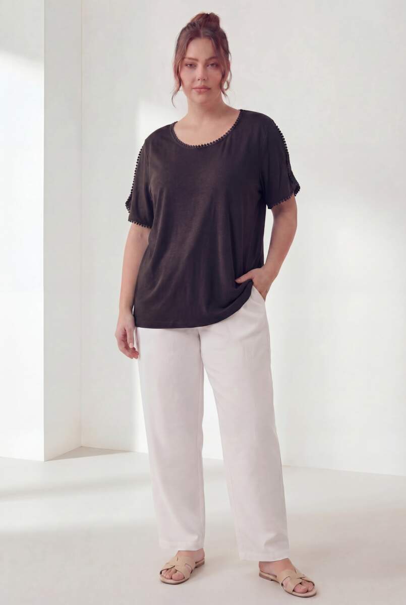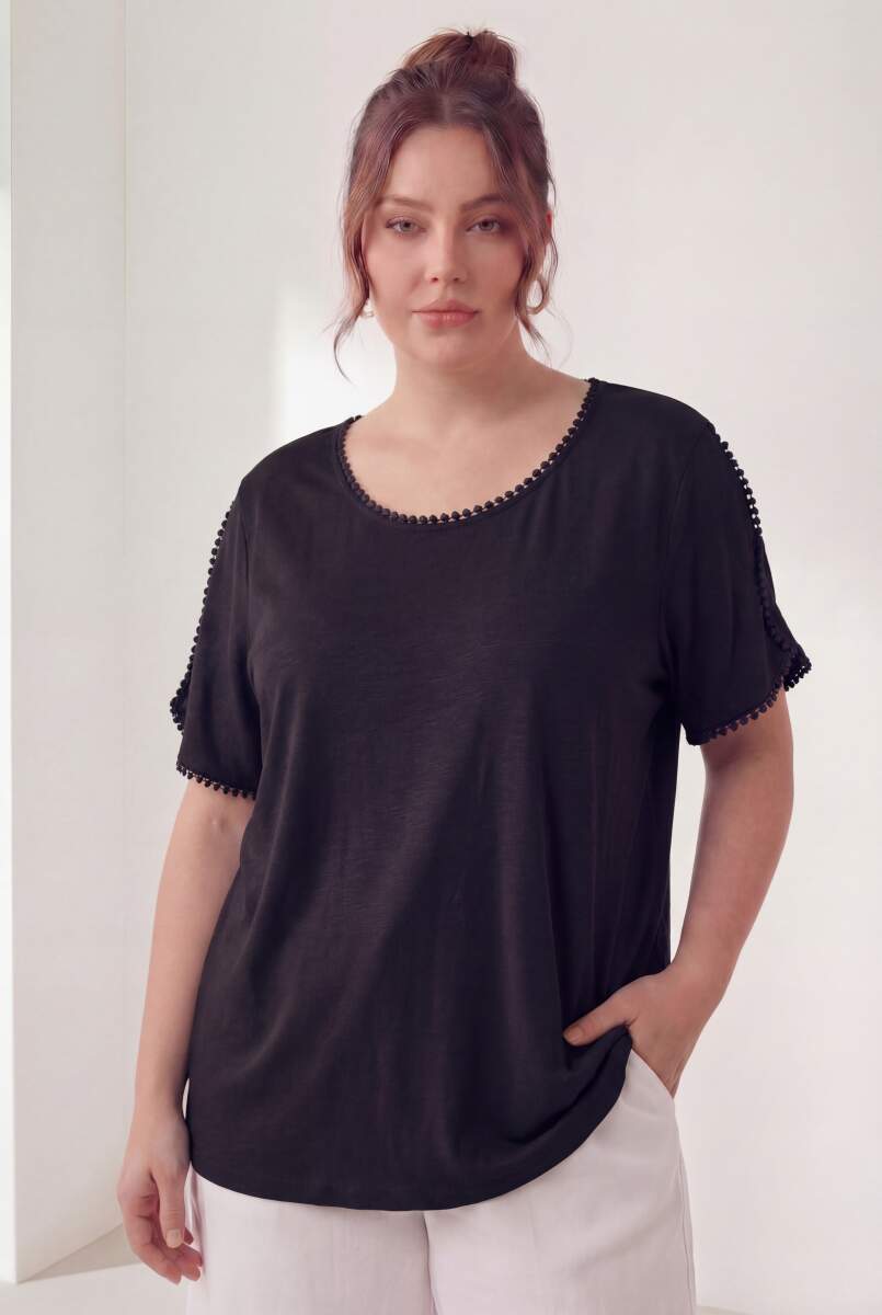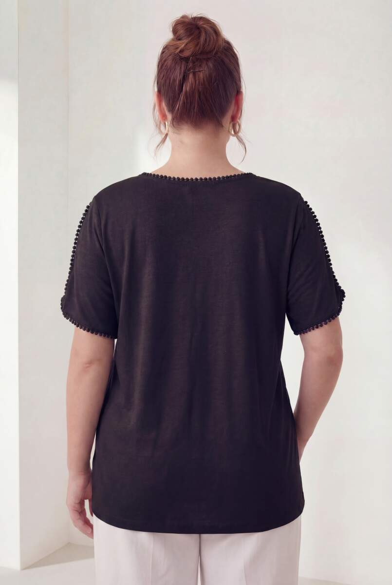 Yaka Ve Kol Güpürlü Kadın Büyük Beden Tişört Siyah