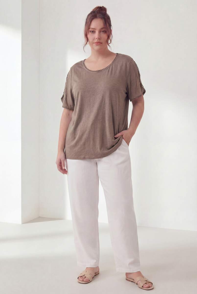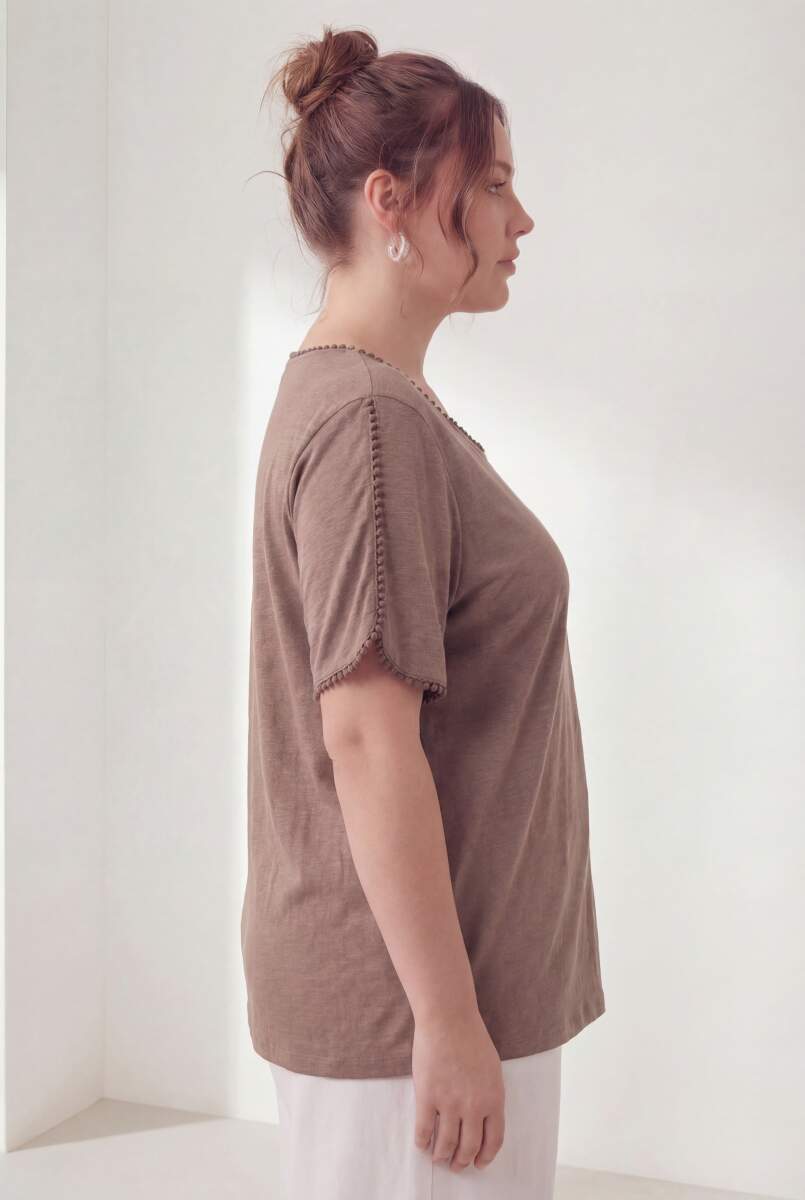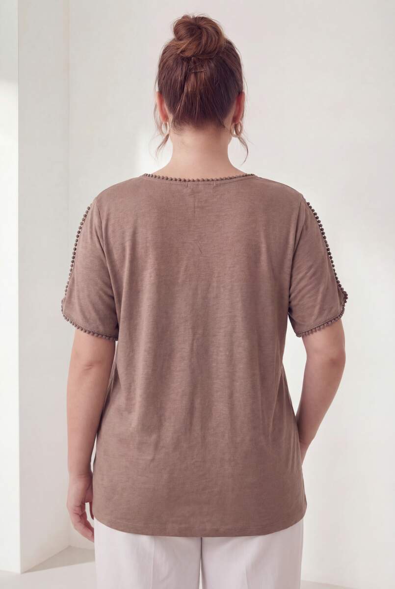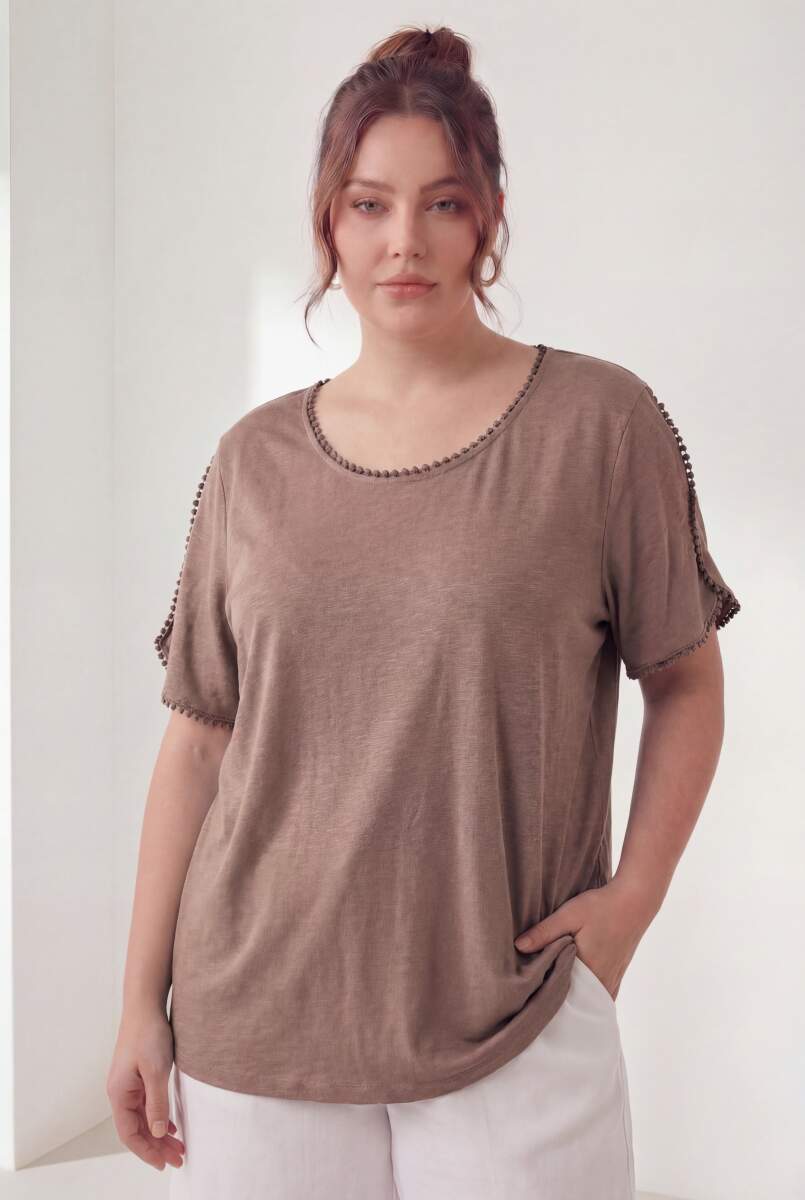 Yaka Ve Kol Güpürlü Kadın Büyük Beden Tişört Vizon
