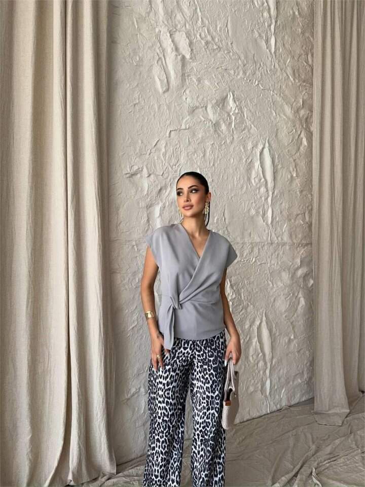 YANDAN BAĞLAMA DETAYLI KOLSUZ BLUZ - Gri