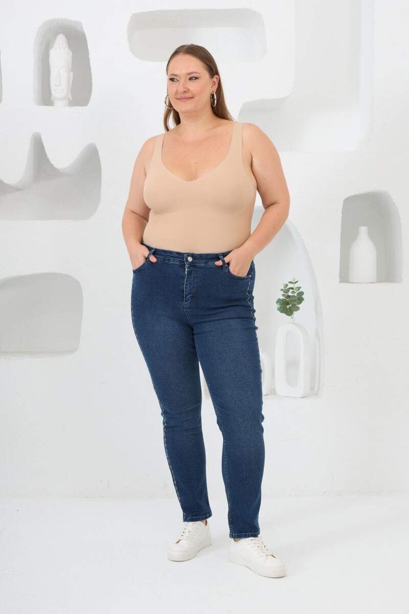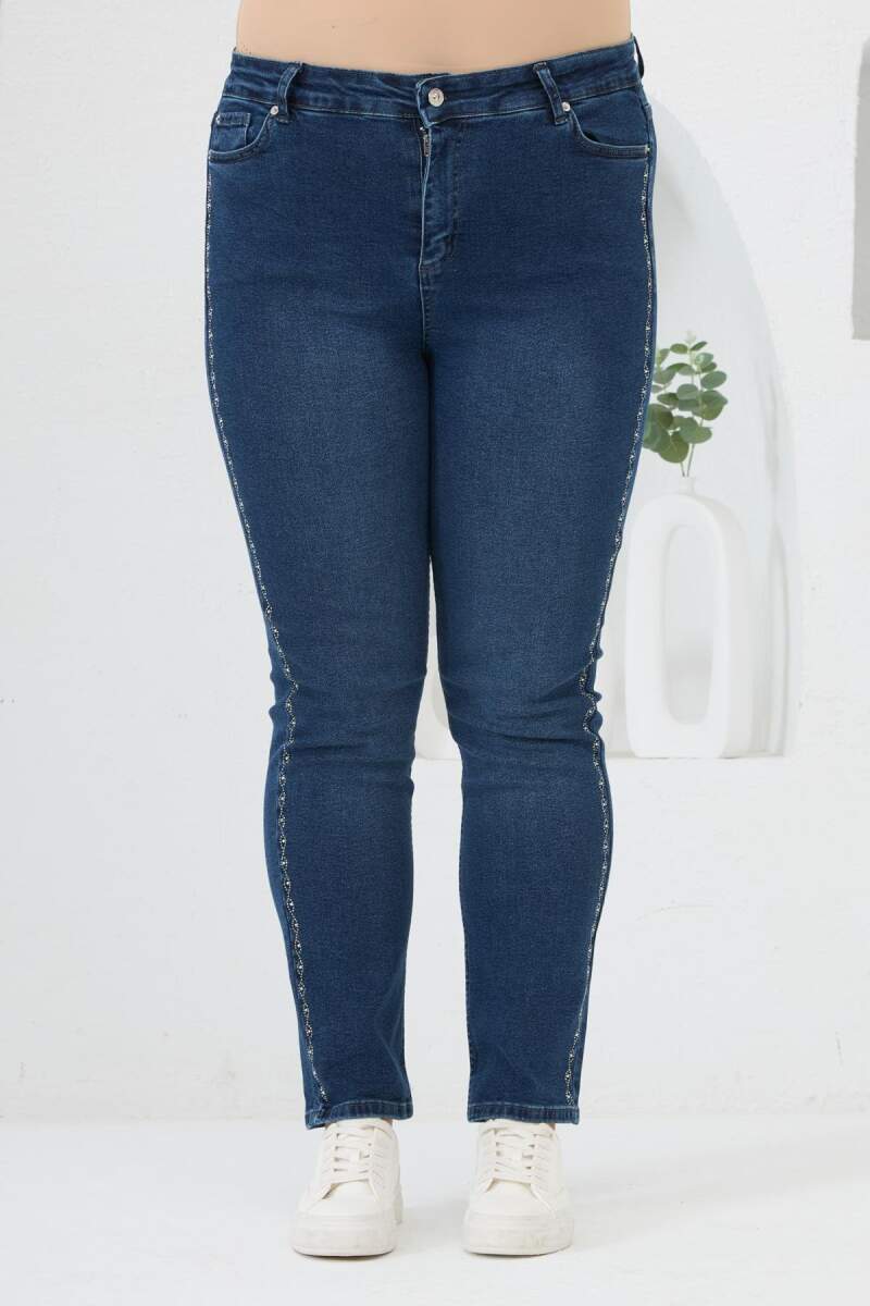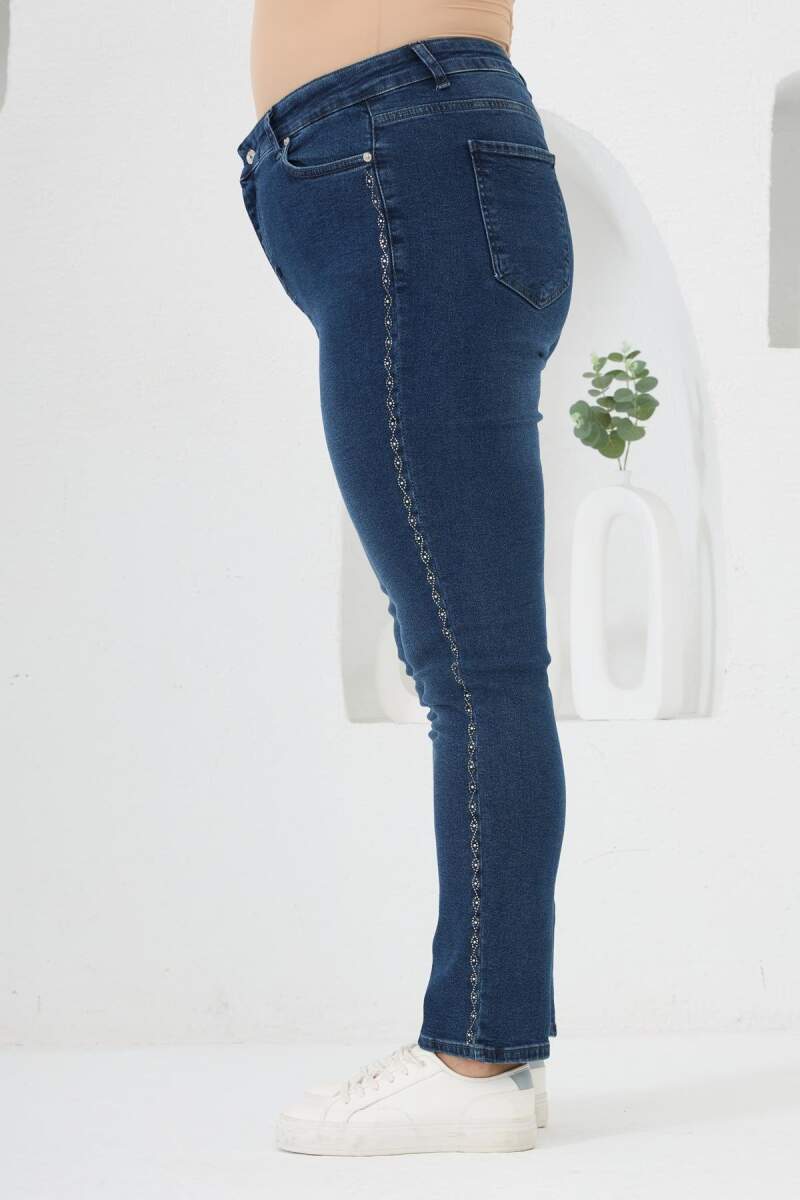 Yanları Taş Baskılı Büyük Beden Kot Pantolon Mavi