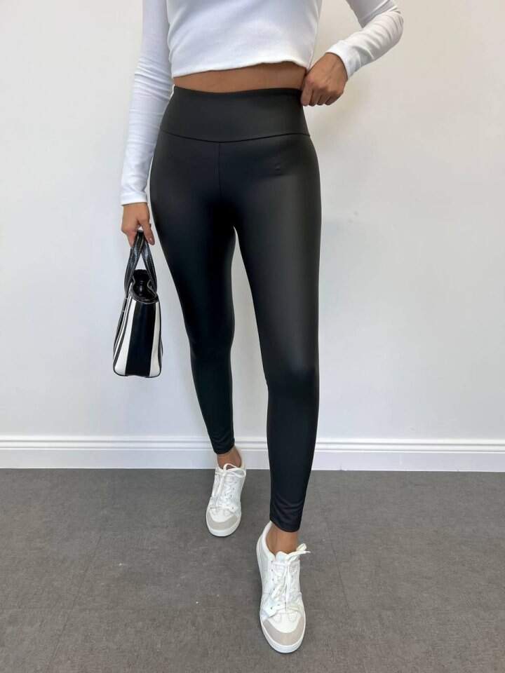 Yüksek Bel Toparlayıcı İçi Şardonlu Deri Tayt